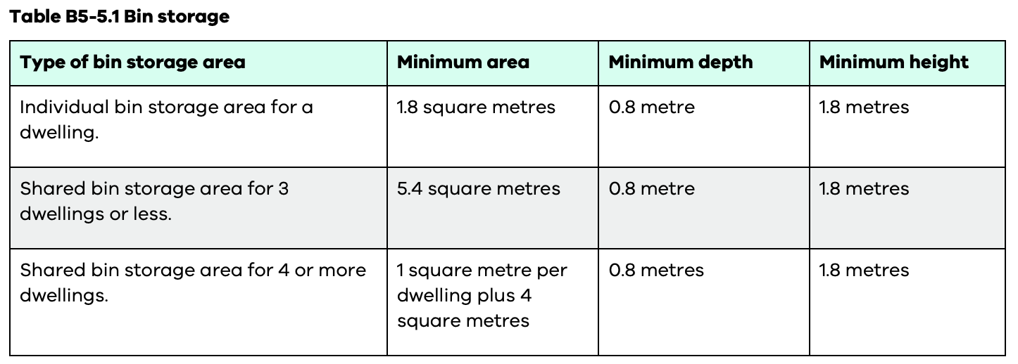 This applies to both individual bin storage areas for each dwelling and shared bin storage areas for multiple dwellings, which now must meet minimum requirements for height, depth, and area (as per Table B5-5.1).
